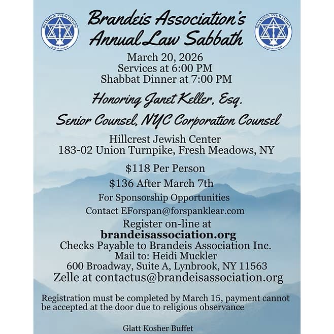 Please join the Brandeis Law Sabbath on March 20, 2026. Reservations are still being accepted, and early bird pricing has been extended until March 13th via ZELLE and CHECK only.