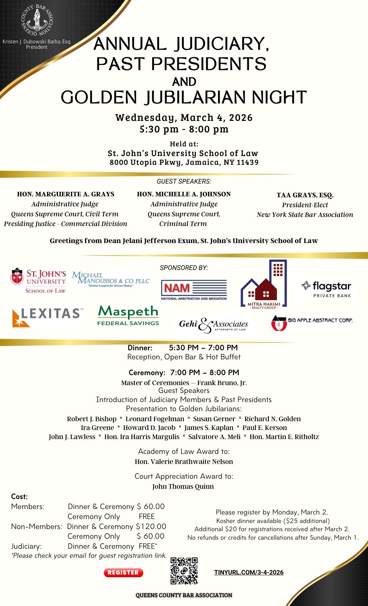 Judiciary, Past Presidents & Golden Jubilarian Night - 3/4/2026 Back to Search Judiciary, Past Presidents & Golden Jubilarian Night - 3/4/2026 Wednesday, March 4, 2026 (5:30 PM - 8:00 PM) (EST) Description Additional Info × St. John's University School of Law 80-00 Utopia Pkwy Jamaica, NY 11439 United States Wednesday, March 4, 2026 (5:30 PM - 8:00 PM) (EST) Registered Guests 251 Registered Guests × Share × Print Email Add to Calendar Facebook LinkedIn X Pinterest Powered By GrowthZone